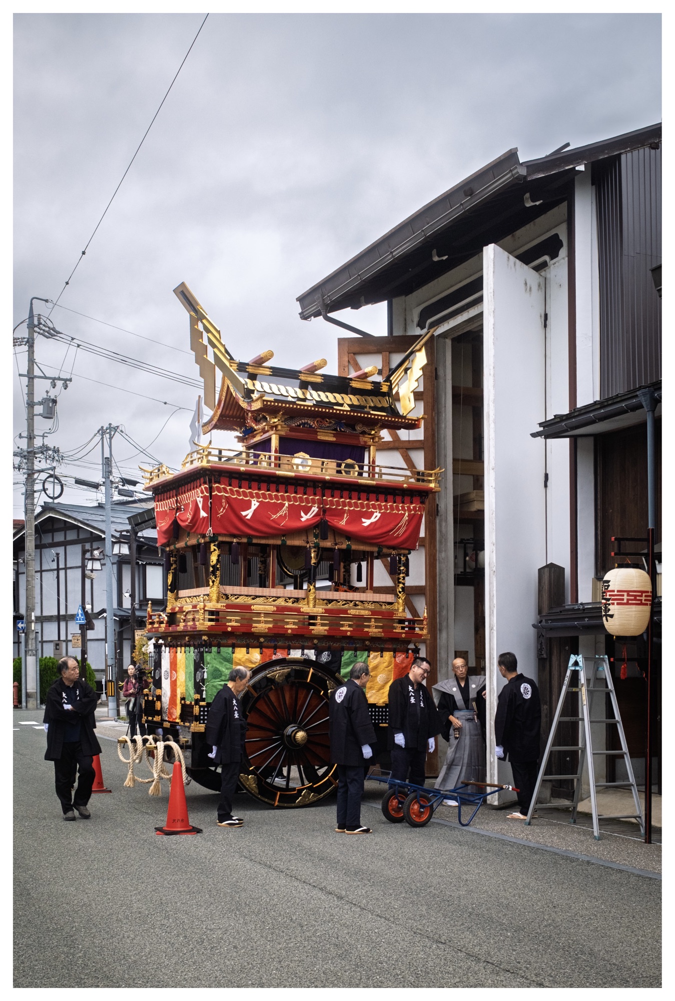 The festival, or Hachiman Matsuri, is an annual festival for Sakurayama Hachimangu Shrine to celebrate a good harvest in autumn. There are 11 (10 this year because one is in the shop for maintenance — you understand why when you see them) matsuri-yatai festival ‘floats’ in the area, and they are paraded around at specific times during the day and then again at night while all lit up. And, there is one particular float that gets all the attention.